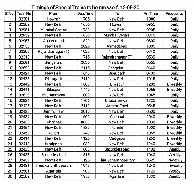 Indian Railways Releases Time Table Of Special Trains And Their Stoppages Service To Begin From Tomorrow